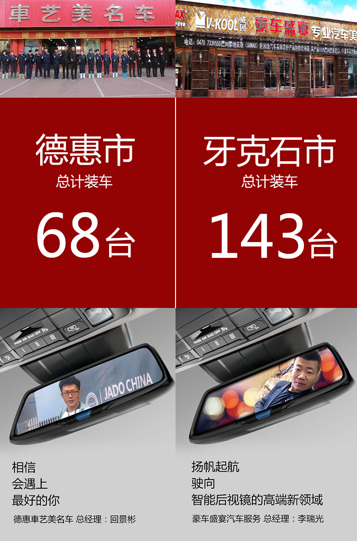 至今,東北地區(qū)捷渡V Series遠界店外營銷車主見面會全線展開,佳木斯、七臺河、五常、雞東、白山、德惠、牙克石地區(qū)已完成,7月份將會有數(shù)場V Series遠界見面會陸續(xù)召開!相信通過這種會議,將會對終端車主帶來全新的體驗方式,也將會有越來越多的車主了解這款互聯(lián)網(wǎng)+智能后視鏡的產(chǎn)品。