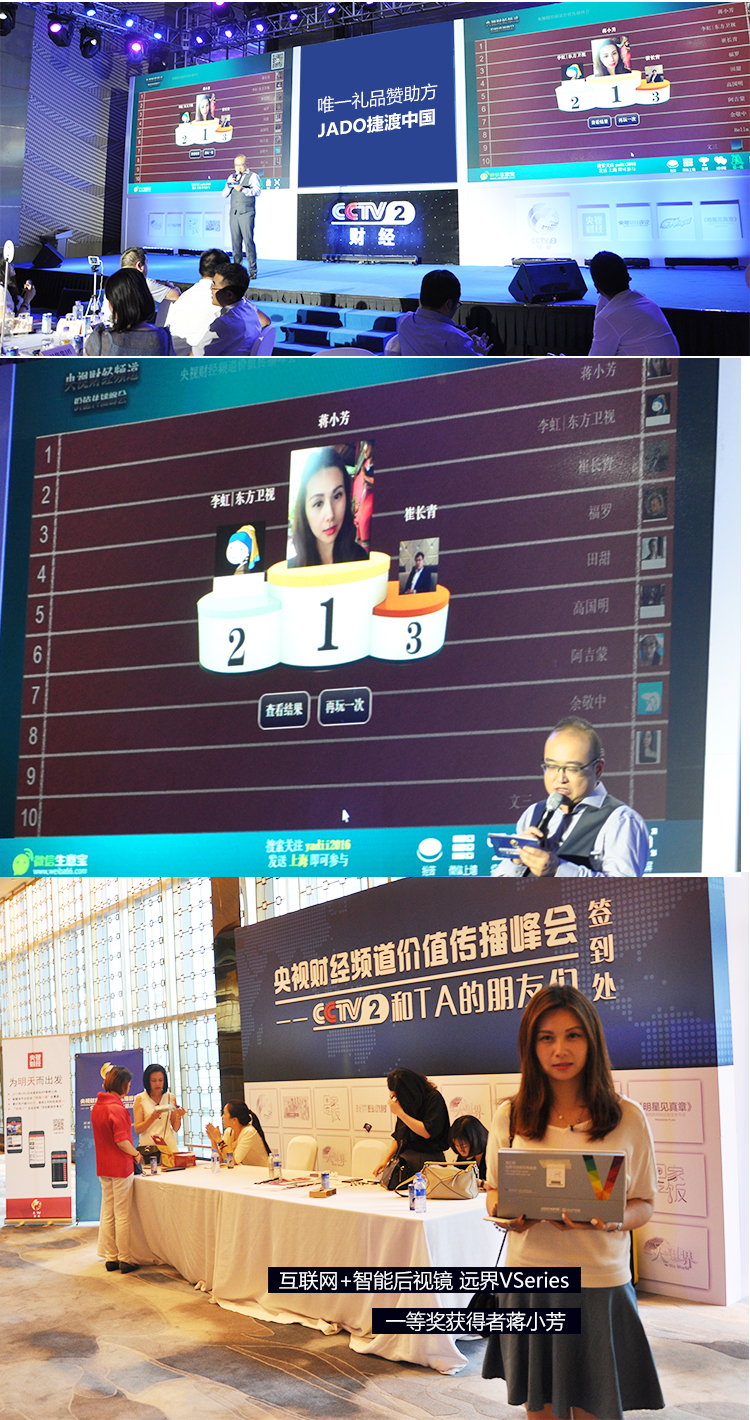JADO捷渡中國聚焦此次“央視財經頻道價值峰會”,只為尋找最受車主關注的節目資源,為車主提供更加豐富多彩的節目。搜集資源,為客戶提供更多更好的機會,JADO捷渡中國已邀請客戶參與錄制過撒貝寧主持的《加油!向未來》,黃西主持的《是真的嗎》,還有尼格買提主持的《開門大吉》。