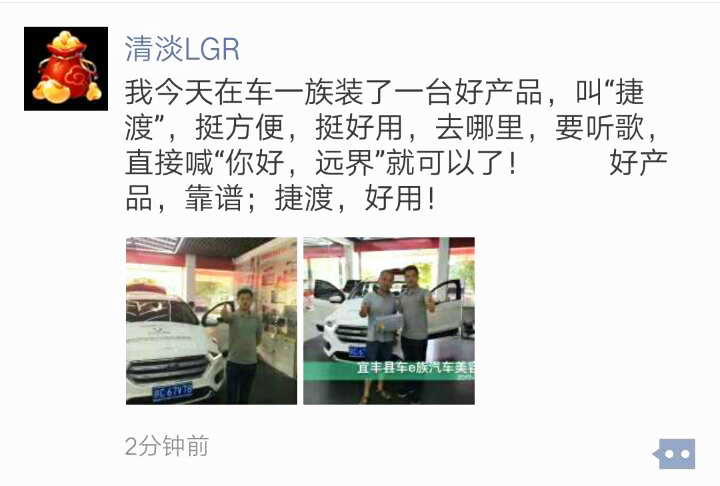 “我今天在車一族裝了一臺(tái)好產(chǎn)品,叫‘捷渡’,挺方便,挺好用,去哪里,要聽(tīng)歌,直接喊‘你好,遠(yuǎn)界’就可以了!好產(chǎn)品,靠譜;捷渡,好用!”一位車主在購(gòu)買(mǎi)了之后,對(duì)此在朋友圈贊不絕口。