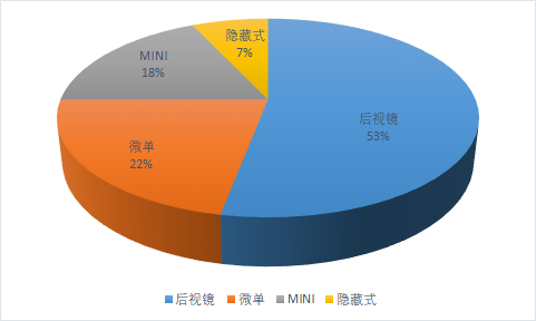 后視鏡記錄儀占比53% ,微單占比22%,MINI占比18%,隱藏式占比 7%。
