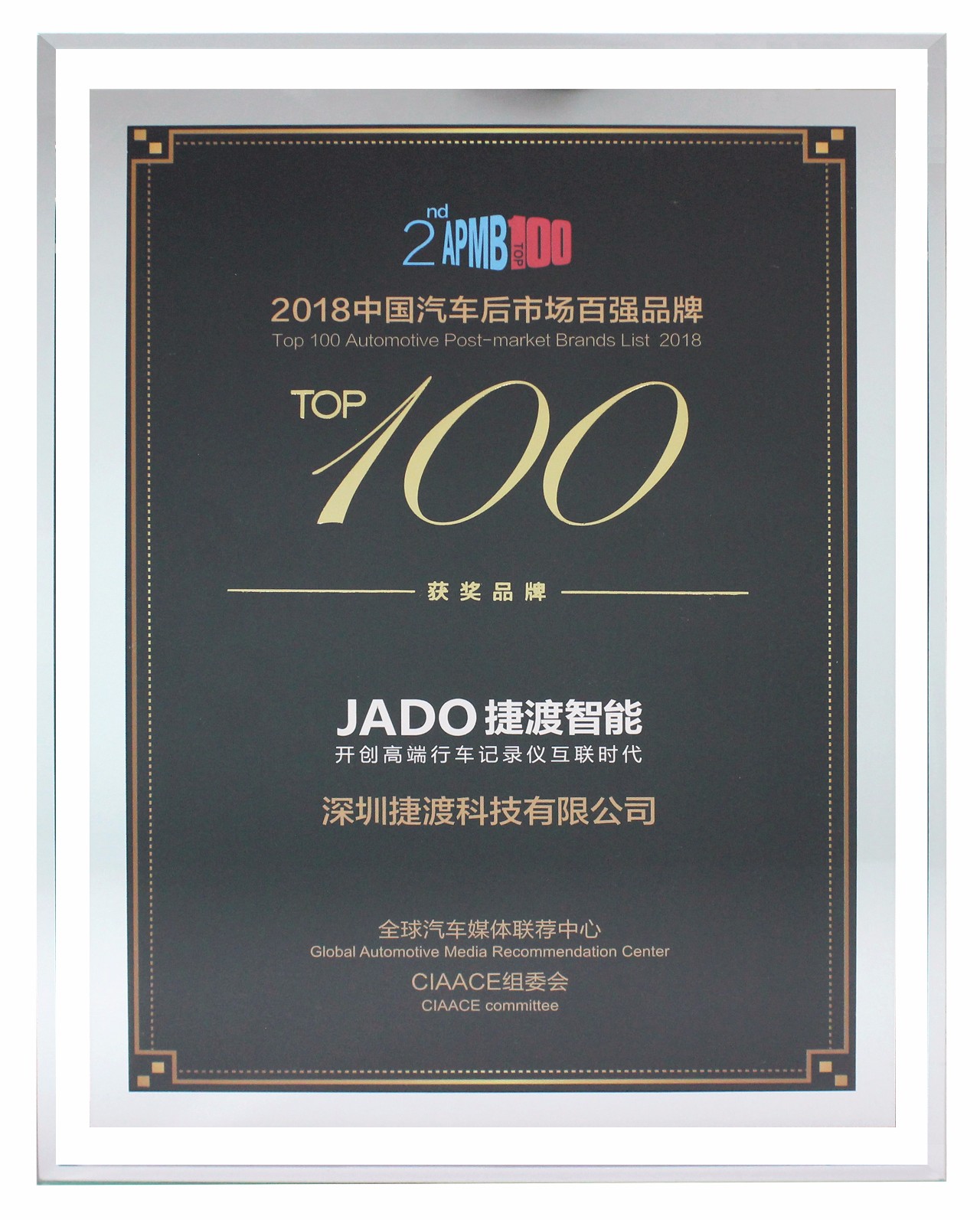2018年6月21日,由雅森國際攜手中國汽車工業協會、中國對外貿易廣州展覽總公司,以及全球權威發榜機構共同發起的《2018第二屆汽車后市場百強品牌榜》評選結果重磅出爐,國內領先的高端行車記錄儀品牌JADO捷渡智能(中國),憑借多樣化的產品和創新的技術,強勢登榜!與3M、奇虎360、統一等汽車后市場領域知名企業同期列入百強榜單,這也是業界對JADO捷渡智能(中國)在行業地位、創新性、成長性、發展潛力等方面的高度認可。