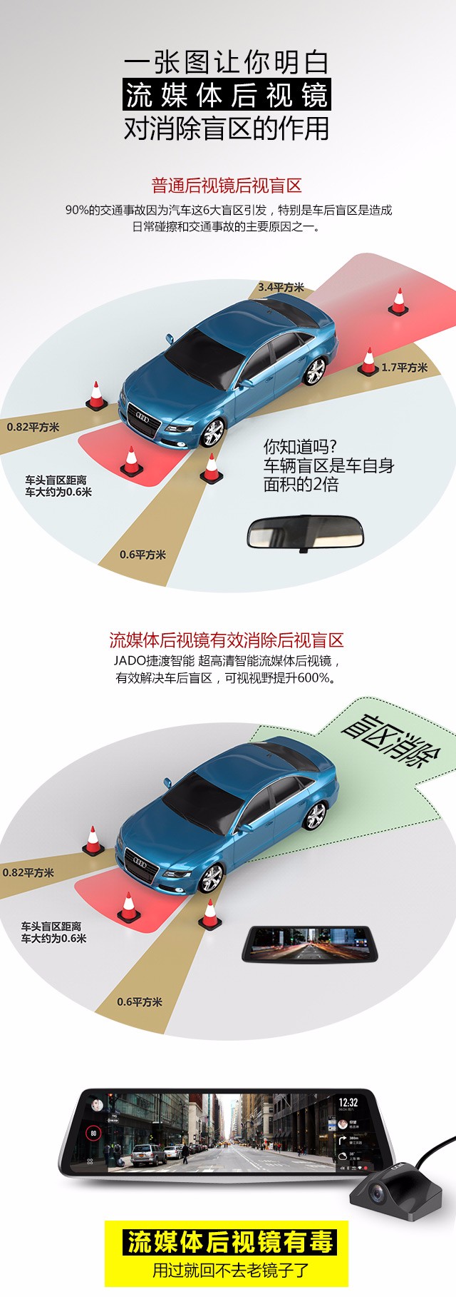 科技的進步推動了人工智能的發展,智慧出行的時代也悄然來臨。但無論在任何時代,“安全”都是出行時所要考慮的第一要素。對于駕駛員朋友而言,安全更是第一責任和要務。全球每年發生的交通事故,90%與駕駛員的視覺盲區有關。為了讓汽車出行變得更加的安全,JADO捷渡智能(中國)2017年在行業內率先推出了VSeries遠界——超高清智能流媒體后視鏡,仿佛讓駕駛員多了一雙“眼睛”,縮小了汽車后方的視野盲區,讓顯示視野提升600%,為車主的行車安全提供了更大的便捷、更安全的行車保障,注定未來必將成為趨勢。