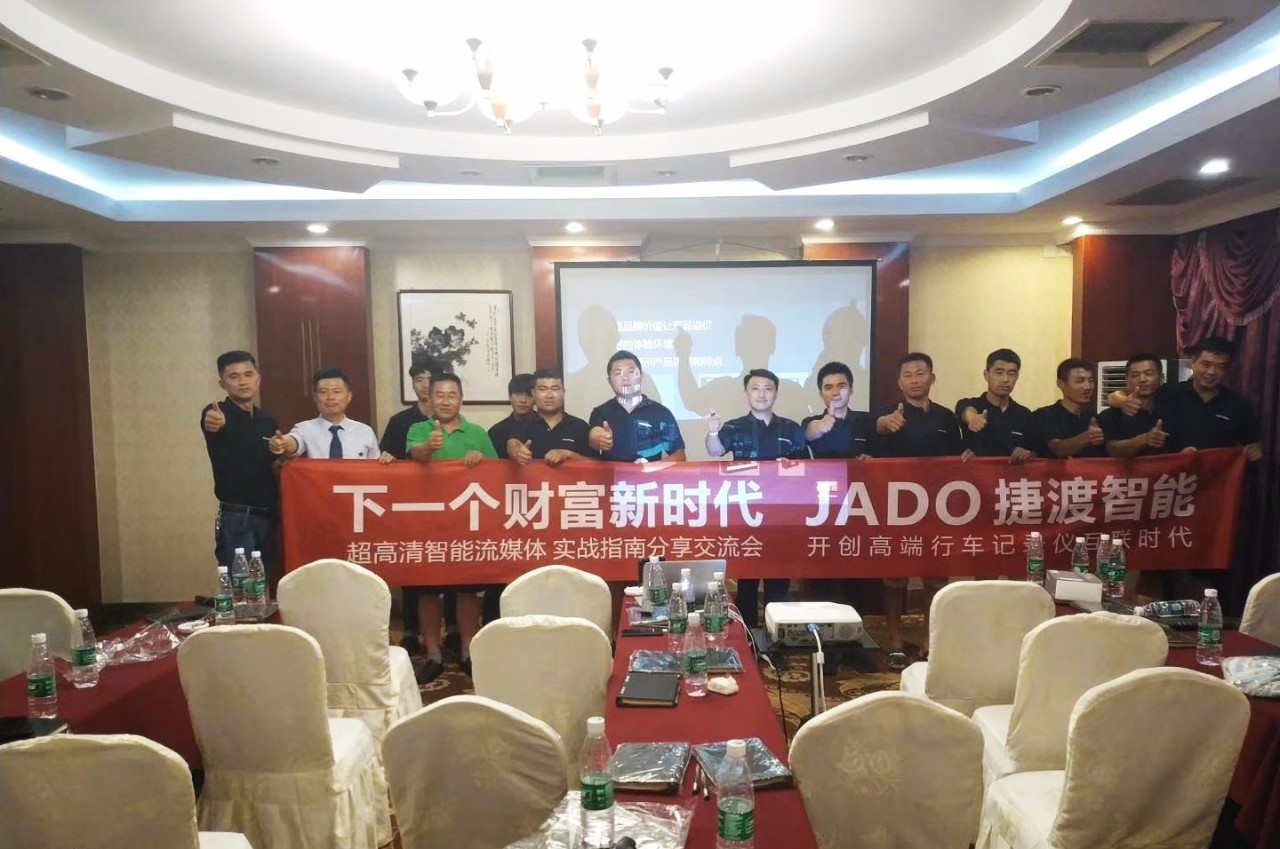 2018年8月9日,JADO捷渡智能(中國)攜手宿州馬武汽車用品有限公司,在安徽省宿州市共同舉行了“VSeries遠界核心店交流培訓會(宿州站)”。來自宿州市多達30家JADO捷渡智能(中國)授權終端店參加了此次會議,聚焦流媒體頂尖新科技,一起抓住行業新商機。