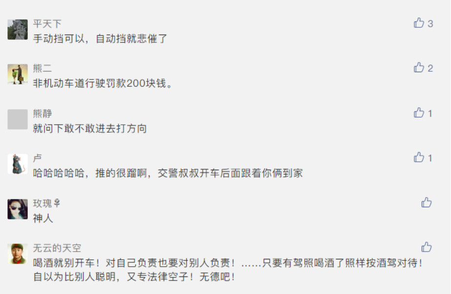小酒怡情大飲傷身,在路面上推車,有一定的交通安全隱患,后方行駛的車輛對這些人會產生安全威脅。小編提醒,為避免酒后駕車,還是應該將車放置到安全地點,或者找熟人代駕,一定要為自己的安全著想!